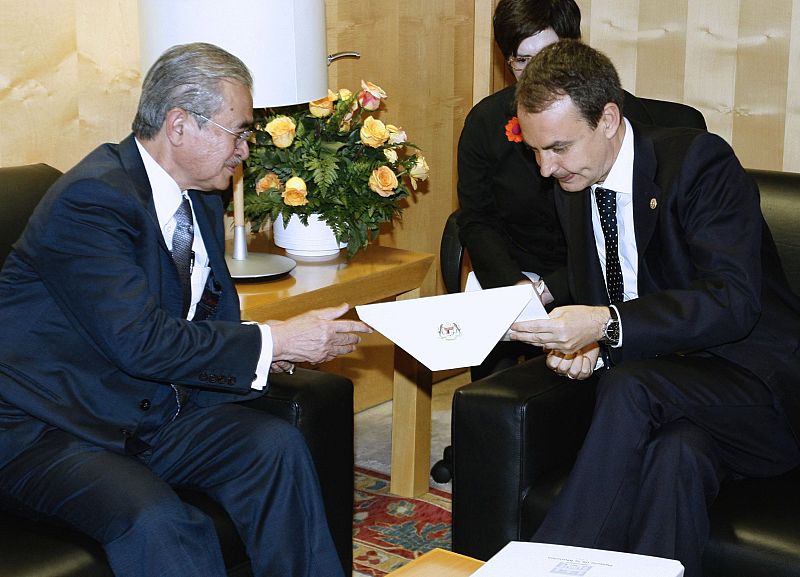 MD93. MADRID, 15/01/08.- El presidente del Gobierno, José Luis Rodríguez Zapatero (d), charla con el primer ministro de Malasia, Abdullah Badawi, durante la reunión bilateral que mantuvieron hoy dentro del I Foro de la Alianza de Civilizaciones, que congrega en el Palacio Municipal de Congresos a más de 350 personalidades de más de 60 países. EFE/Juanjo Martín ***POOL***