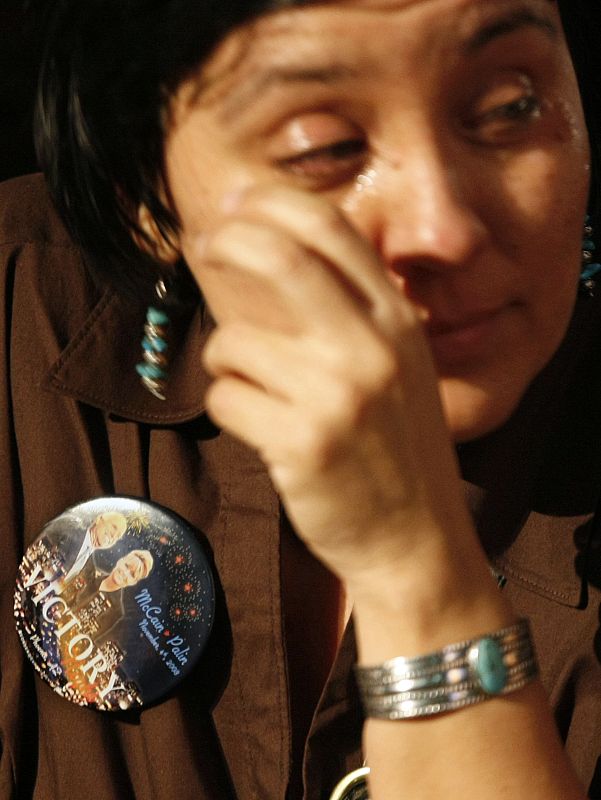 A woman who is a supporter of U.S. Republican presidential nominee Senator John McCain (R-AZ) cries after television networks called the election in favor of Senator Barack Obama (D-IL) during McCain's election night rally in Phoenix, November 4, 2008. REUTERS/Rick Wilking (UNITED STATES) US PRESIDENTIAL ELECTION CAMPAIGN 2008 (USA)