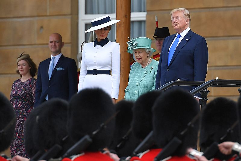 La reina Isabel II junto a Donald Trump y su esposa Melania en la ceremonia de bienvenida en el Palacio de Buckingham