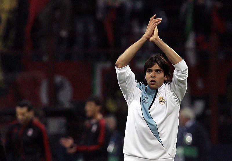 Real Madrid's Kaka waves as he arrives on the field for the warmu p before the start of the Champions League soccer match against AC Milan in Milan.
