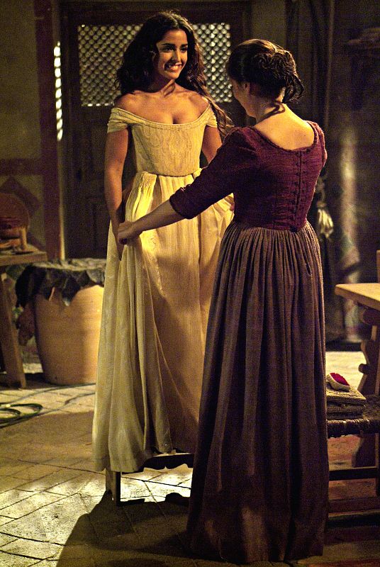 Catalina está ayudando a Margarita con algunos retoques del vestido.