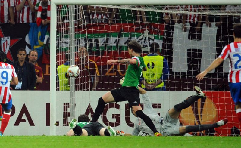 • El jugador del Atlético de Madrid, Radamel Falcao, dispara su segundo frente a Athletic