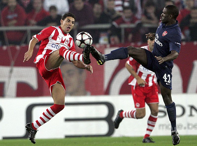 09.12.2009Kerrea Gilbert del Arsenal lucha por el balón con Oscar Gonzalez del Olimpiacos del Pireo.EFE