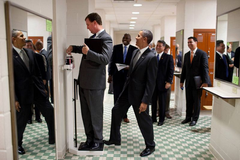 30.01.2021Agosto de 2010. Obama gasta una broma a su director de viajes, Marvin Nicholson, pisándole la báscula cuando este trata de pesarse en una visita a la Universidad de TexasCasa Blanca