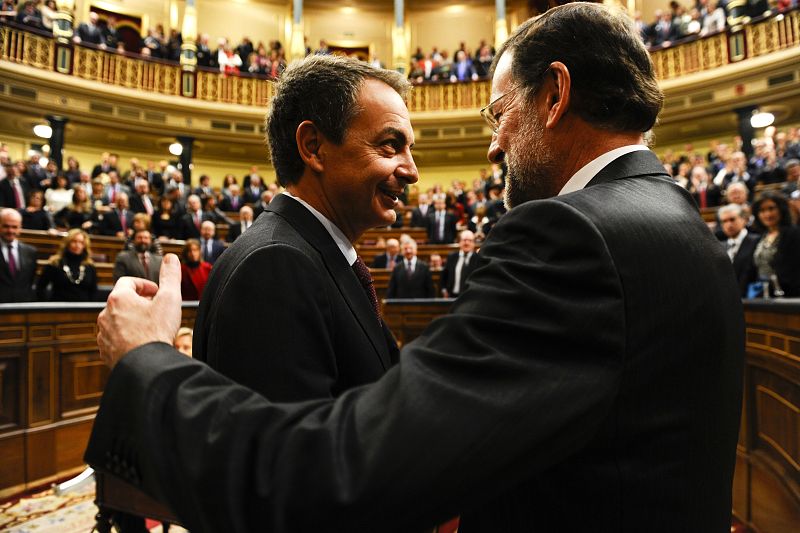 19.12.2011Spain's new Prime Minister Mariano Rajoy (R) is congratulated by Spain's outgoing Prime Minister Jose Luiz Rodriguez Zapatero (L) after Spain's parliament voted to make conservative leader Mariano Rajoy the new prime minister, on December 20, 2011 in Madrid. Members of the 350-seat lower house Congress voted by a majority of 187 to install Rajoy, whose Popular Party won an absolute majority in the November 20 election. AFP PHOTO / PIERRE-PHILIPPE MARCOU POOLAFP PHOTO / PIERRE-PHILIPPE MARCOU POOL -