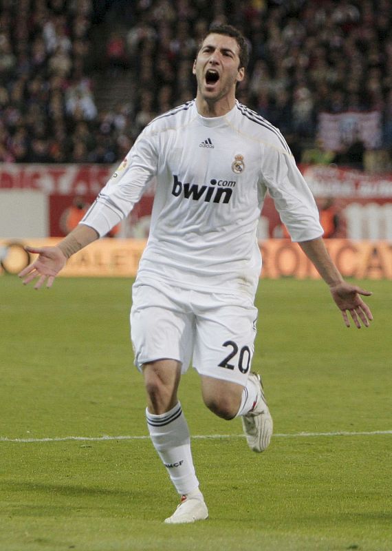 07.11.2009Gonzalo Higuaín celebra el tercer gol del equipo blanco.EFE