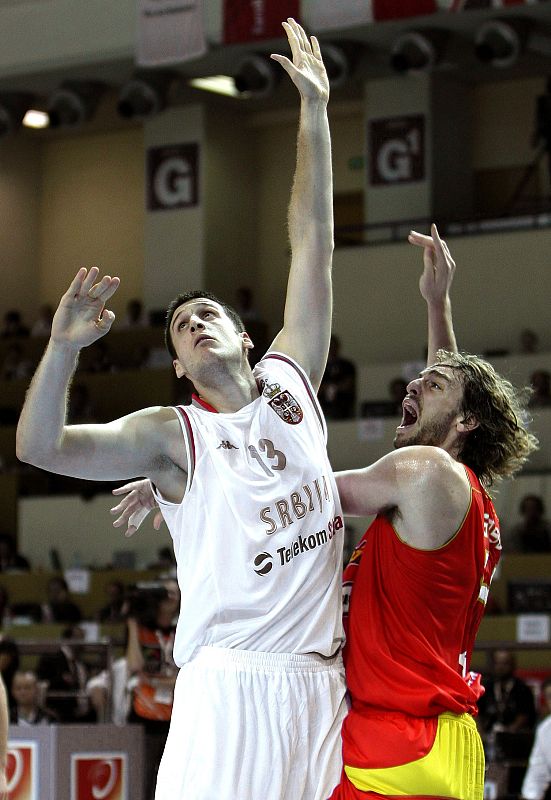 Gasol y el de pívot de Serbia, Nenad Krstic, luchan por el balón.