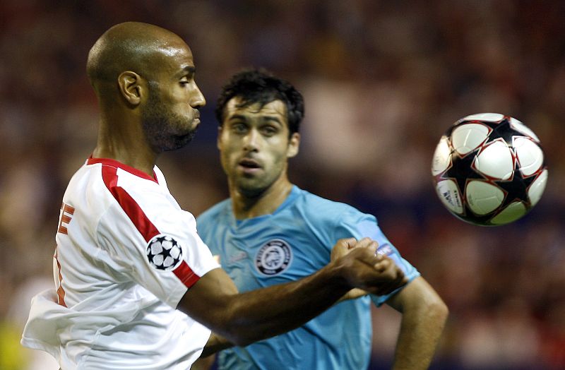 16.09.2009Kanoute controla el balón ante el defensa del Unirea Irzicenic, Vasile Maftei.EFE