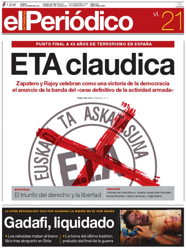 Las portadas del anuncio de ETA de acabar con la violencia (y la muerte de Gadafi)