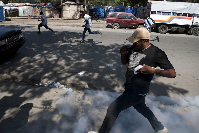 18.11.2010(((CORRIGE TÍTULO))) HAI04. PUERTO PRÍNCIPE (HAITÍ), 18/11/2010.- Varias personas corren hoy, miércoles 18 de noviembre de 2010, para evitar los gases lacrimógenos lanzados por la policía a los manifestantes durante una protesta en contra de la Misión de Naciones Unidas para la Estabilización de Haití (MINUSTAH) en las inmediaciones de Champ Mars en Puerto Príncipe (Haití). EFE/Andrés Martínez CasaresEFE/Andrés Martínez Casares
