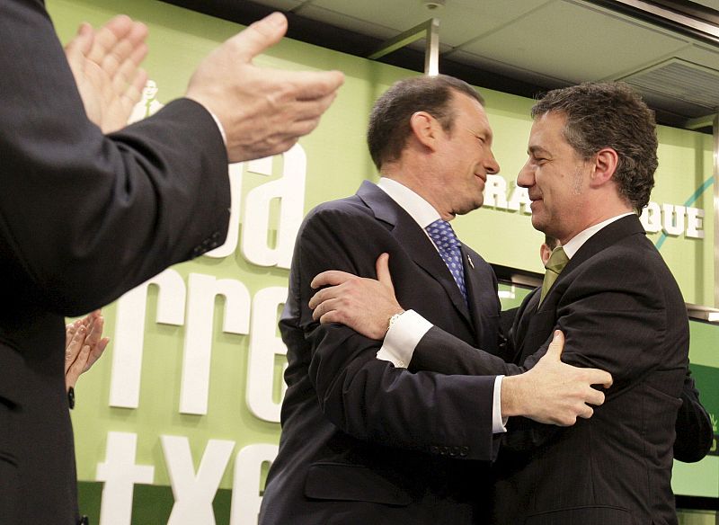 02.03.2009BIL39. BILBAO (VIZCAYA), 01/03/09.- El candidato a la reelección como lehendakari, Juan José Ibarretxe (i), se abraza con el presidente del PNV Iñigo Urkullu (d) tras conocer los resultados obtenidos por su partido en las elecciones autonómicas en el País Vasco, celebradas hoy. EFE/Alfredo AldaiEFE/Alfredo Aldai