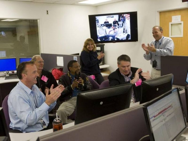 El equipo de la NASA que coordinaba la misión aplaude después de que el cohete Centauro se separara con éxito de la sonda