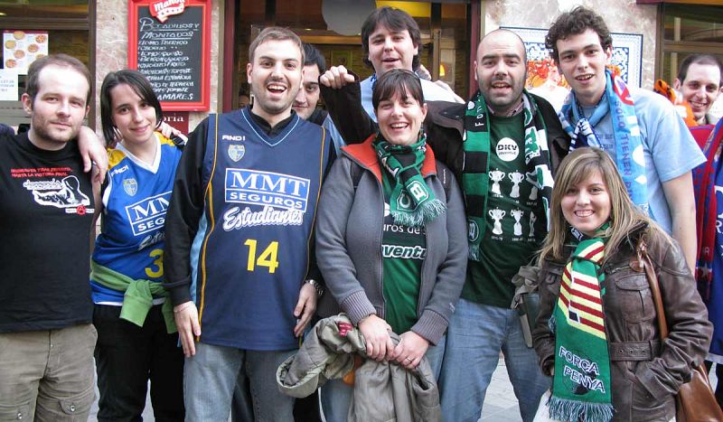 El baloncesto une aficiones. Integrantes de "La Demencia" y seguidores de La Penya posan juntois para una foto.