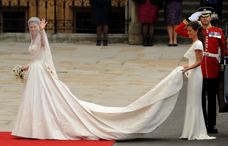 Kate Middleton (L) waves as she arrives with her sister, the Maid of Honour Philippa Middleton at the West Door of Westminster Abbey in London for her wedding to Britain's Prince William, on April 29, 2011. AFP PHOTO / BEN STANSALL