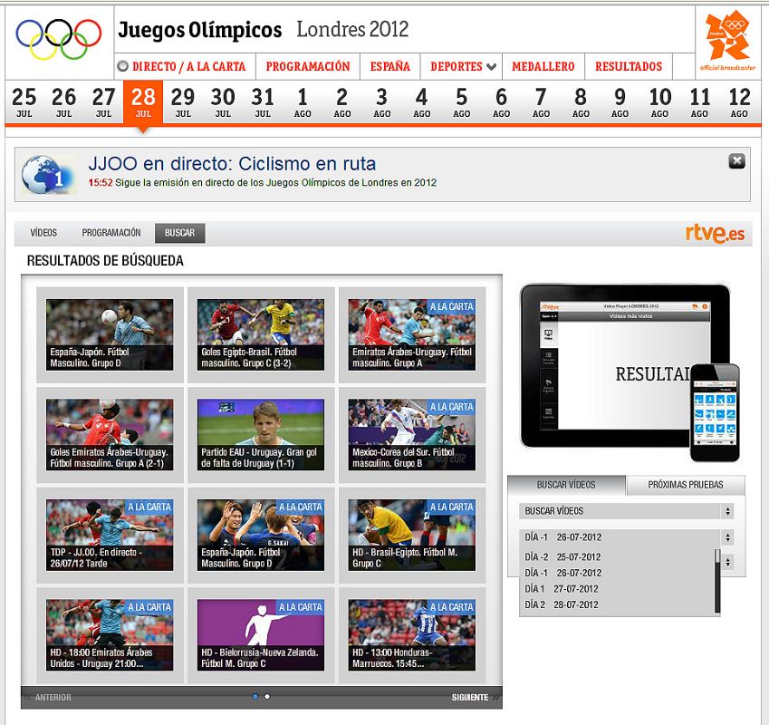 28.07.2012Y si te has dejado algo sin ver, siempre puedes utilizar la pestana Buscar videeos, a la derecha de la pantalla, para acceder a los vídeos de las pruebas ya disputadas para disfrutar de ellas a la carta.RTVE