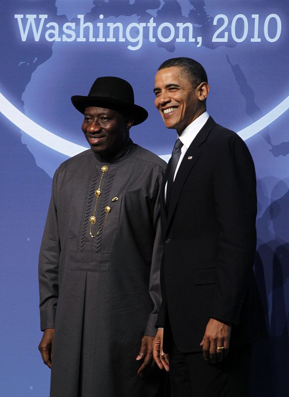 12.04.2010U.S. President Barack Obama poses with Acting President of Nigeria Goodluck E. Jonathan (L) upon his arrival at the Nuclear Security Summit in Washington April 12, 2010. Obama opened a 47-nation summit dedicated to keeping nuclear arms from terrorists and seeks momentum with China in his push for a new round of sanctions on Iran. REUTERS/Jason Reed (UNITED STATES - Tags: POLITICS MILITARY)REUTERS/Jason Reed