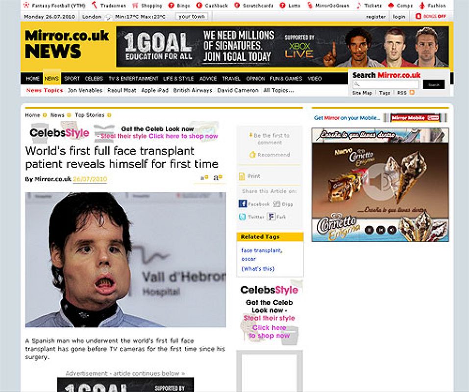 La edición digital del británico 'Daily Mirror' se hace eco de las declaraciones del primer trasplantado total de cara.