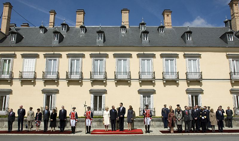 Los príncipes de Asturias, junto al príncipe de Gales y la duquesa de Cornualles al inicio de la recepción oficial que les ofrecen en el Palacio de El Pardo.