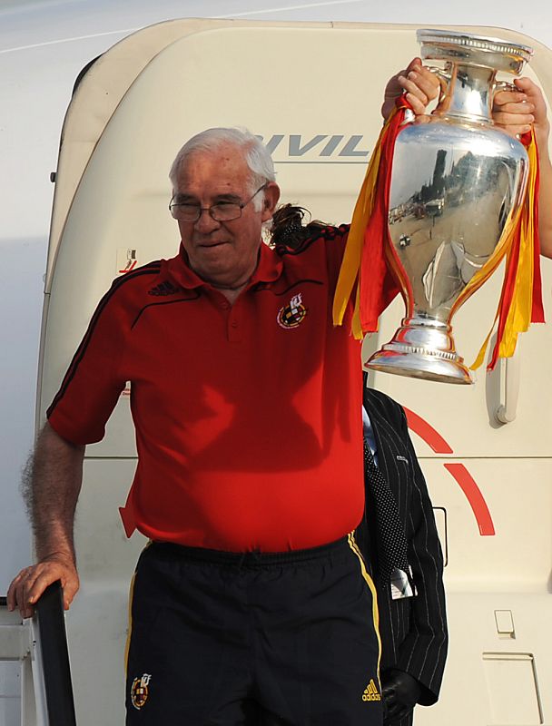 (FILES) A picture taken on June 30, 2008 shows Spain's Euro 2008 football trainer Luis Aragones holding up the trophy on arrival at Barajas airport in Madrid. Luis Aragones, the coach of Spain's 2008 European Championship-winning side, died in Madrid on February 1, 2014 at the age of 75, the Spanish Football Federation (RFEF) announced. AFP PHOTO/ PEDRO ARMESTRE