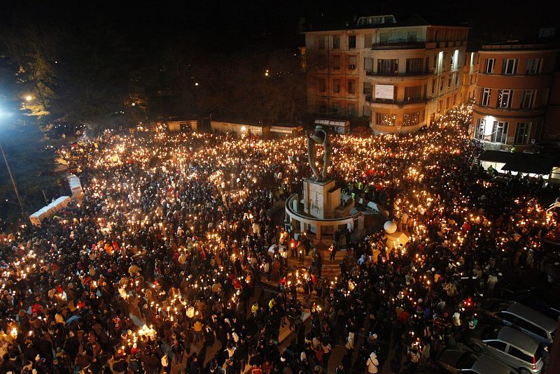 Procesión con antorchas en honor a las víctimas del terremoto de L'Aquila (Italia)