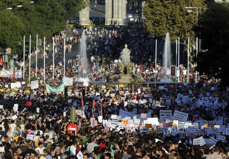 16.10.2011MD45. MADRID, 15/10/2011.- Cientos de manifestantes al inicio de la manifestación más numerosa del 15O, una marcha que ha partido esta tarde de la céntrica plaza de Cibeles y finalizará en la Puerta del Sol. Unas 80 ciudades españolas celebran hoy marchas pacíficas dentro del movimiento mundial de "indignados" que, con el lema "Unidos por el cambio global", invitan a salir a la calle para exigir a los "poderes establecidos que no actúen en beneficio de unos pocos". EFE/Javier LizónEFE/J.Casares -