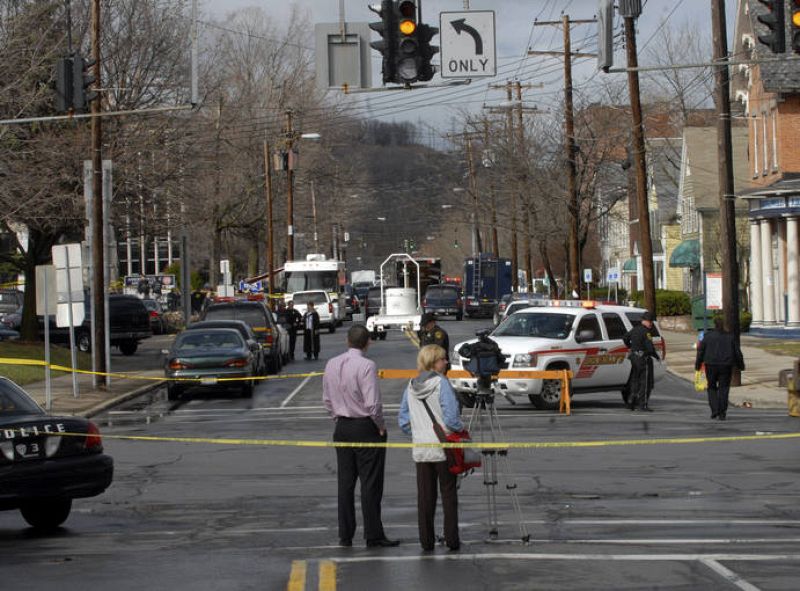 03.04.2009Police investigate a shooting scene outside the American Civic Center on Front Street in Binghampton, New York April 3, 2009. A gunman killed 12 or 13 people at an immigration services center in Binghamton, New York, on Friday after walking in and randomly opening fire on people taking exams to become U.S. citizens, officials said. REUTERS/Hans Pennink (UNITED STATES CONFLICT SOCIETY DISASTER POLITICS)REUTERS/Hans Pennink