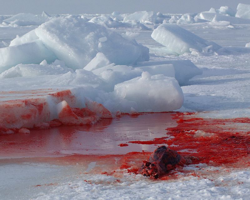 25.03.2009Con el comienzo de la caza, el hielo donde normalmente viven las focas se cubre de sangre. La primera fase de la caza de focas se concentrará en los hielos flotantes que rodean las islas de la Magdalena, en el centro del Golfo de San Lorenzo.REUTERS/Paul Darrow -