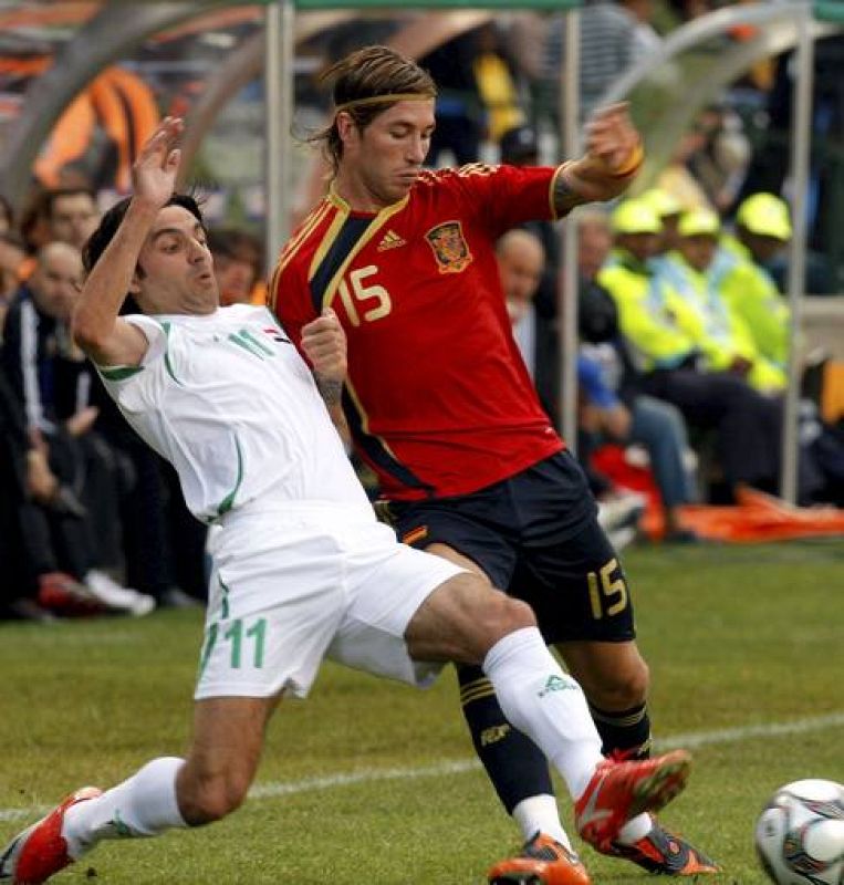 Sergio Ramos pugna por el balón con el centrocampista de la selección de Irak Hawar Mulla Mohammed.