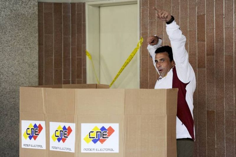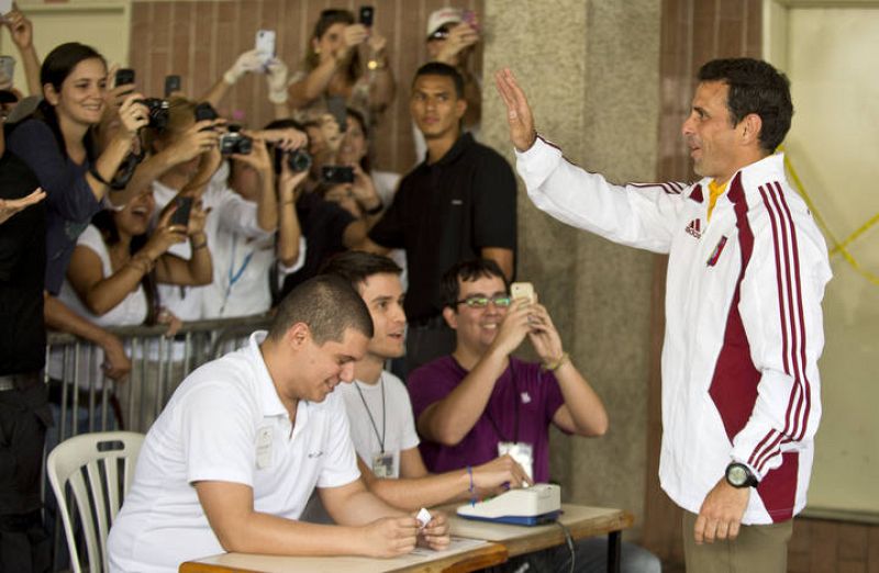 Venezuelan opposition presidential candidate Henrique Capriles gestures before preparing his vote in Caracas, on April 14, 2013. Venezuelans flocked to the polls Sunday to vote for Hugo Chavez's successor, choosing between the handpicked heir of his socialist revolution and an opponent vowing change in the divided nation. AFP PHOTO / LEO RAMIREZ