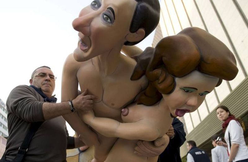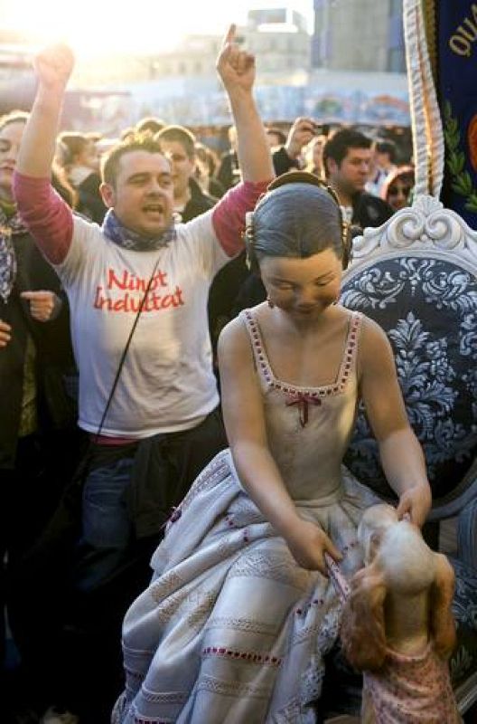 15.03.2009V30.VALENCIA, 15/03/09.- Falleros de la Falla de Quart-Palomar bailan alrededor del ninot "Queridas mascotas", realizado por el artista Federico Ferrer, que ha sido indultado por votación popular y no será quemado el próximo 19 de marzo, cuando ardan todas las fallas de Valencia. EFE/Kai Försterling.EFE/Kai Försterling