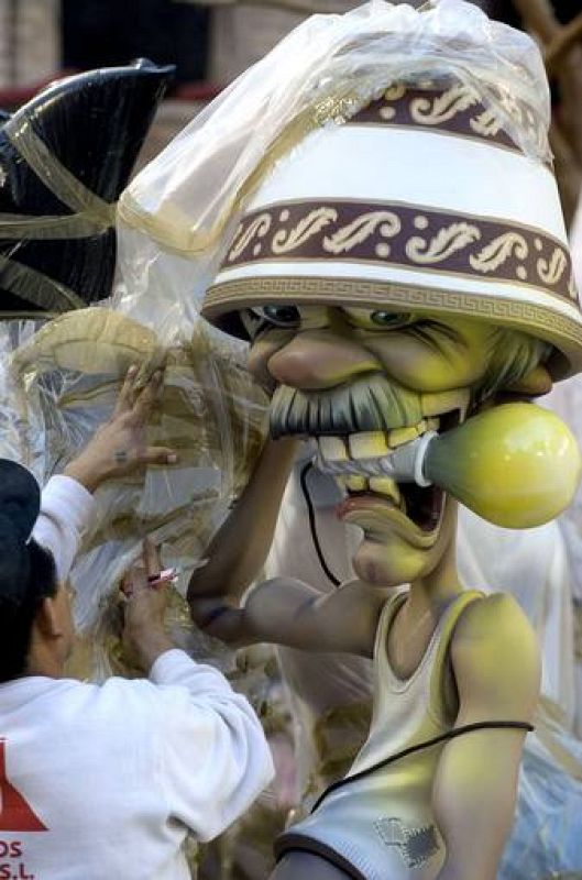 15.03.2009V34.VALENCIA, 15/03/09.- Un artista fallero desenvuelve un ninot para ser integrado en el monumento cuya "Plantá" tiene lugar esta noche. EFE/Kai Försterling.EFE/Kai Försterling. -
