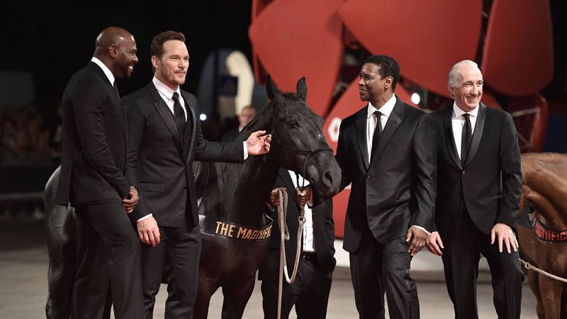 10.09.2016El directorAntoine Fuqua (i),el actor Chris Pratt y el actorDenzel Washington llegan con caballos a la premier de 'Los Siete Magníficos' que ha tenido lugar tras la ceremonia de premios de la Mostra de Venecia.AFP PHOTO / TIZIANA FABI -