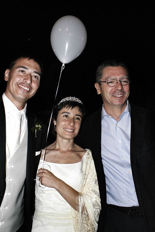 20.09.2009MD58. MADRID, 19/09/09.- El alcalde de Madrid, Alberto Ruiz-Gallardón (dcha), posa con una pareja de novios durante la suelta "poemas voladores", pequeños textos líricos de Ajo y Benjamín Prado en forma de globos de helio, en la Plaza Mayor de Madrid, dentro de la cuarta edición de La Noche en Blanco. EFE/Ángela RíosEFE/Ángela Ríos -
