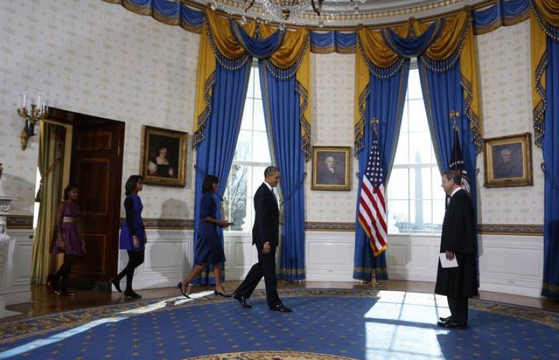 20.01.2013US President Barack Obama (2nd R) enters the Blue Room to take the oath of office from US Supreme Court Chief Justice John Roberts (R) as first lady Michelle Obama and daughters Malia and Sasha follow at the White House in Washington on January 20, 2013. AFP PHOTO/Larry Downing/PoolAFP PHOTO/Larry Downing/