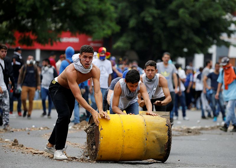 19.04.2017Manifestantes contra el presidente venezolano Nicolás Maduro construyen una barricada con barriles de combustible en Caracas.CARLOS GARCIA RAWLINS