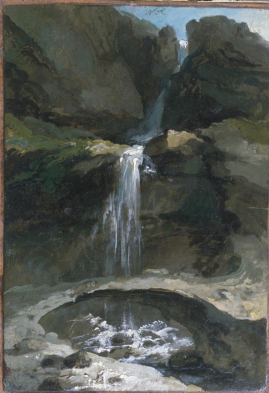 Caspar Wolf. 'Cataratas Geltenbach en el valle de Lauenen con un puente de hielo', hacia 1778. Óleo sobre cartón.