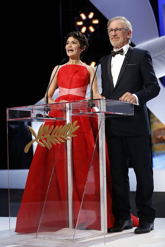 26.05.2013French actress and mistress of ceremonies at the Cannes Film Festival Audrey Tautou (L) and US director and President of the Feature Film Jury Steven Spielberg speak on stage on May 26, 2013 during the closing ceremony of the 66th edition of the Cannes Film Festival in Cannes. AFP PHOTO / VALERY HACHEAFP PHOTO / VALERY HACHE