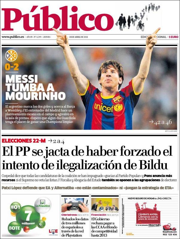 28.04.2011"Messi tumba a Mourinho" titula el diario 'Público' en su portada tras el 0-2 conseguido por el FC Barcelona en el estadio Santiago Bernabéu en el encuentro de ida de la semifinal de la 'Champions'.Público