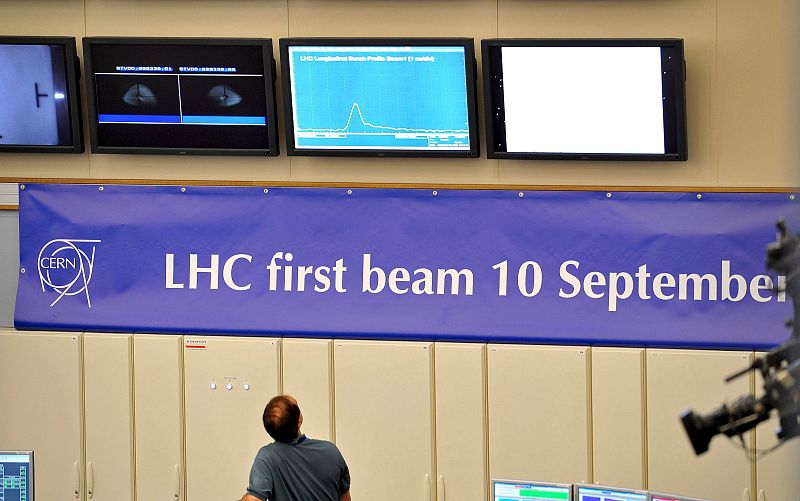 Un científico del Laboratorio Europeo de Física de Partículas observa un monitor durante el encendido del LHC esta mañana