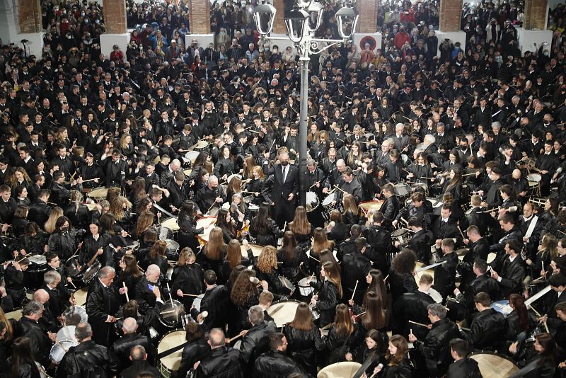 El alcalde de la localidad de Híjar, Luis Carlos Marquestán (c), da la señal para que cientos de tambores y bombos "rompan la hora" a las 00:00 horas del Viernes Santo en la Plaza de España de la localidad turolense, momento culmen de la Semana Santa en el Bajo Aragón.
