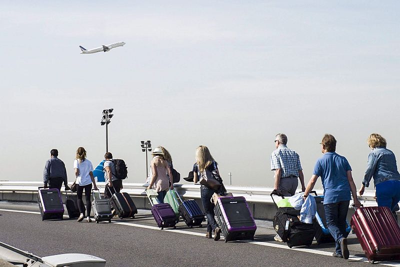 Pasajeros arrastran sus maletas camino del aeropuerto internacional de Niza