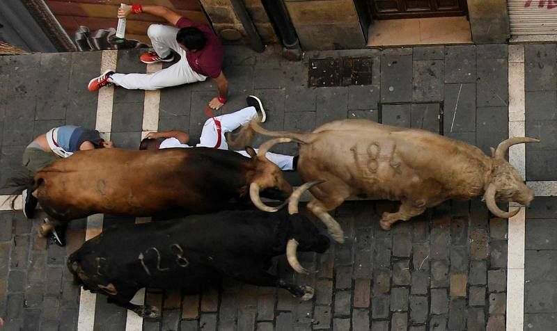 11.07.2018Jarandero, Gavilán y Juncoso arrollan a varios corredores a su paso por las calles de Pamplona en el quinto encierro de los Sanfermines 2018. Los toros de Núñez del Cuvillo completan el recorrido en 2 minutos y 50 segundos.AFP/JOSE JORDAN