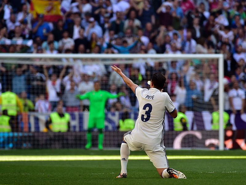 08.04.2017El central portugués Pepe dedica el gol a toda la afición presente en el Bernabéu.