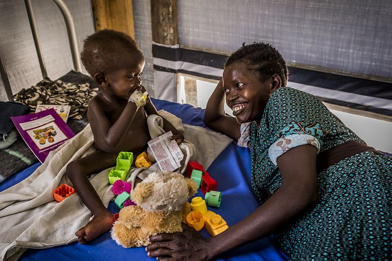 Un niño que sufre de desnutrición severa descansa junto a su madre. El 58% de los refugiados de Sudan del Sur en Uganda son niños menores de 18 años. En total, el 86% de ellos son mujeres o niños.