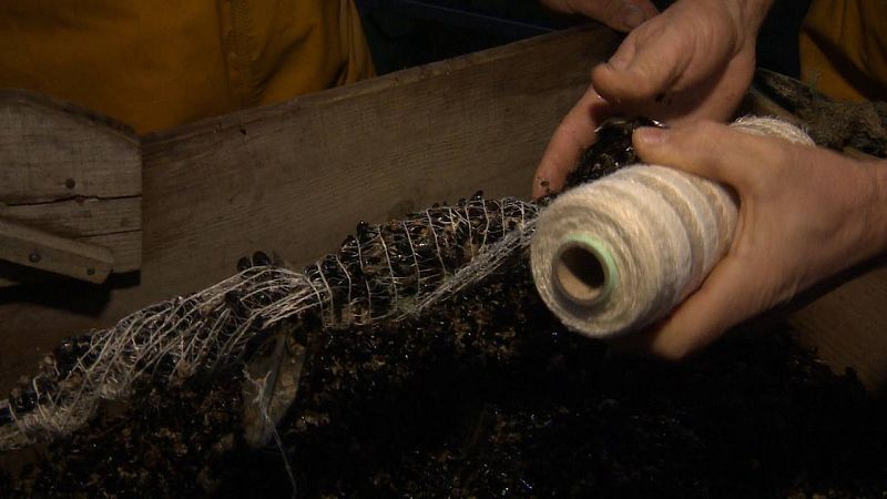 Colocando mejilla, cría de mejillón, en la cuerda