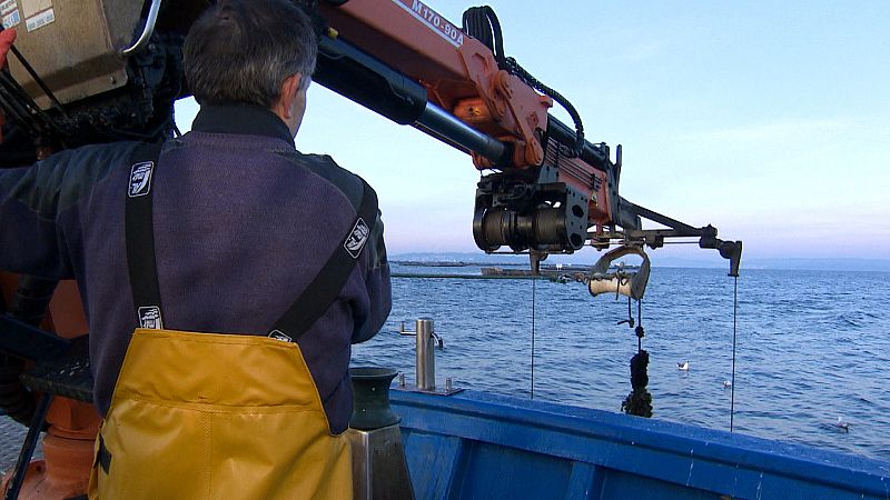 José Antonio sube con la grúa una cuerda cargada de mejillones