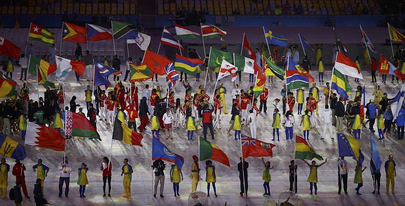 21.08.2016Como paso previo a la salida de los deportistas, el desfile de las banderas de los países participantes. La española, aunque no se ve en la imagen, la porta Chuso García Bragado.