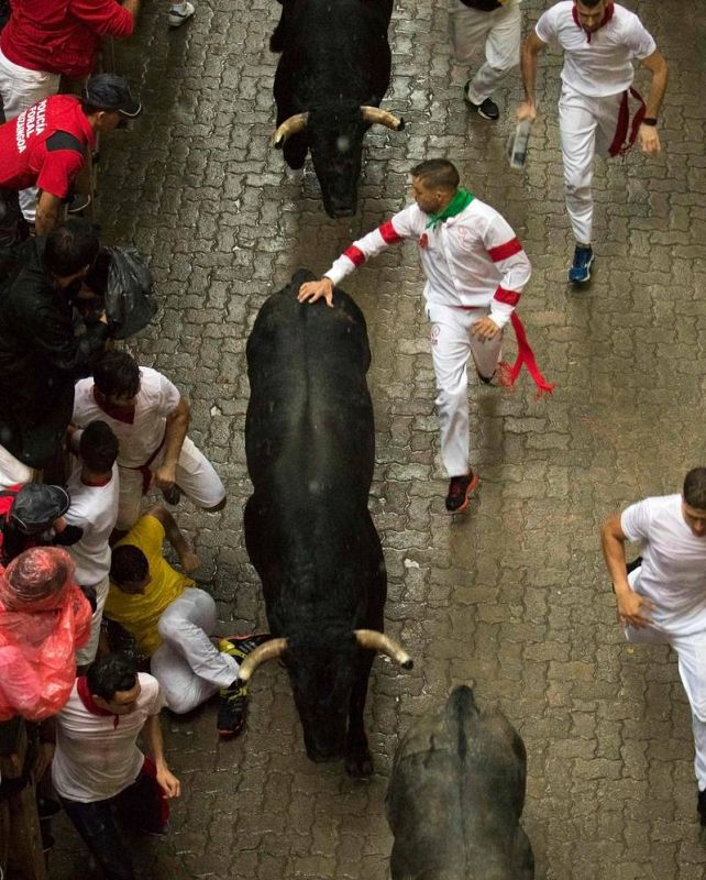 08.07.2018Los toros de José Escolar pasan de largo frente a varios corredores parados en el segundo encierro de los Sanfermines 2018 caracterizado por la lluvia persistente.AFP/ANDER GILLENEA