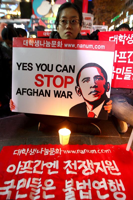 19.11.2009JHK101 SEÚL (COREA DEL SUR) 18.11.09.: Activistas surcoreanos participan en una manifestación contra la visita del presidente estadounidense, Barack Obama, en Seúl (Corea del Sur), el 18 de noviembre. Barack Obama llegó hoy a Seúl procedente de Pekín, en la última etapa de su gira asiática, para abordar el programa nuclear norcoreano y las relaciones bilaterales con Corea del Sur. EFE/JEON HEON-KYUNEFE/JEON HEON-KYUN