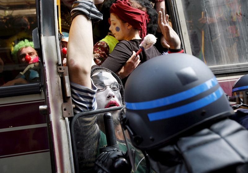 03.04.2009Policías franceses empujan a manifestantes disfrazados de payasos, al interior de un autobús en Neuhof, un suburbio de Estrasburgo, Francia hoy viernes 3 de abril de 2009 durante la celebración de la cumbre del 60 aniversario de la OTAN. (03/04/09)EFE/LUCAS DOLEGA